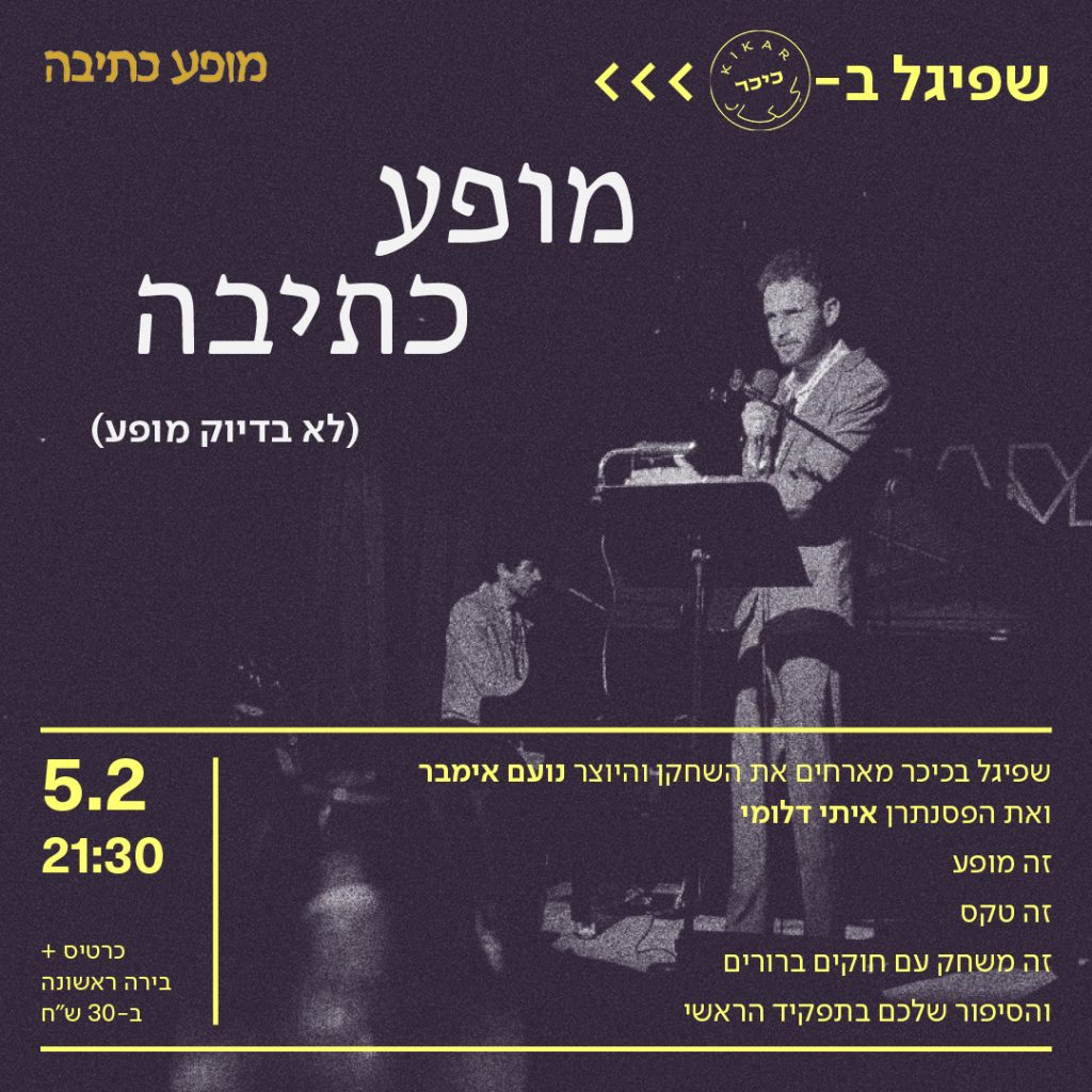 שפיגל בכיכר מארחים את השחקן והיוצר נועם אימבר ואת הפסנתרן איתי דלומי: זה מופע, זה טקס, זה לא מתוכנן, זה רולטה. יודעים איך זה יתחיל, לא יודעים איך זה יגמר. זה משחק עם חוקים ברורים: אסור לכתוב את מה שלא מוכנים להקריא, תהיה במה, יהיה מקרופון, יהיה פסנתרן גחמתי, ומחברת, ועט, ואת הסיפור שלכם.